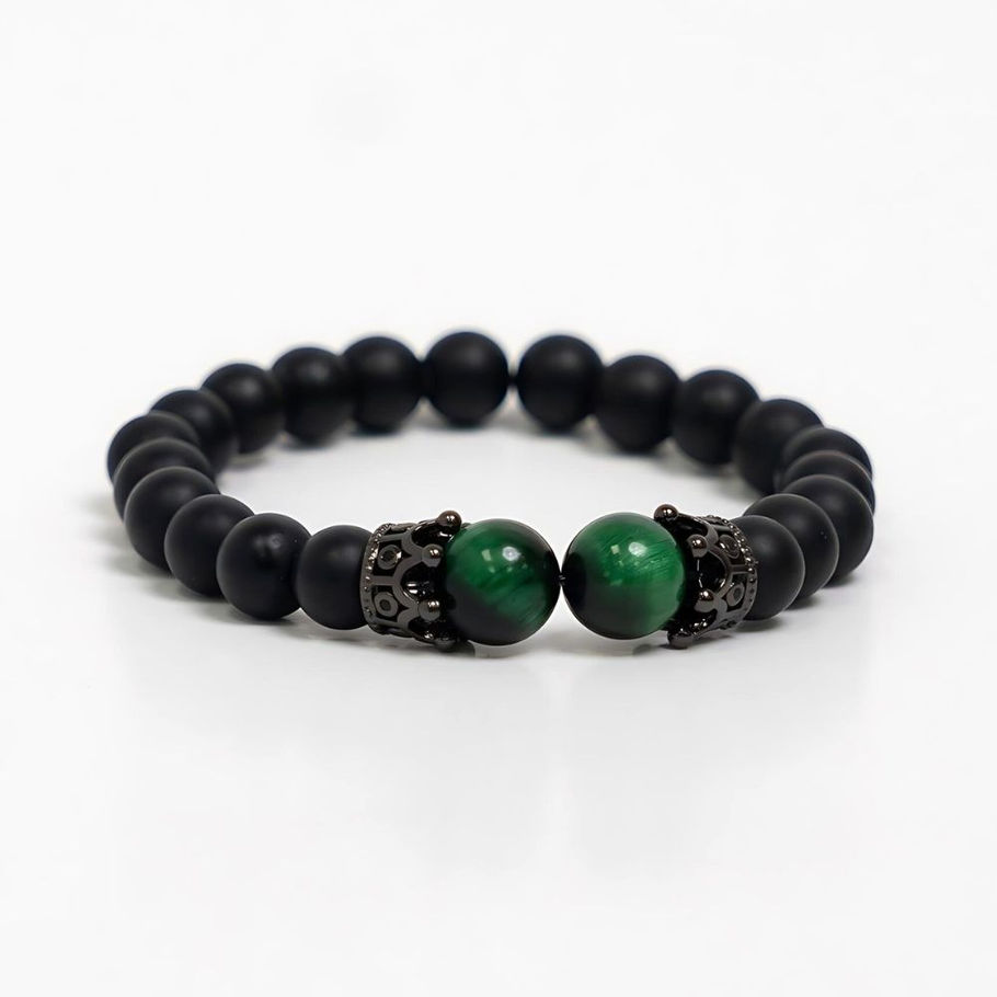 Introducing our Handmade Matte Onyx and Green Tiger’s Eye Bracelet, accented with a striking black crystal and aluminum crown.